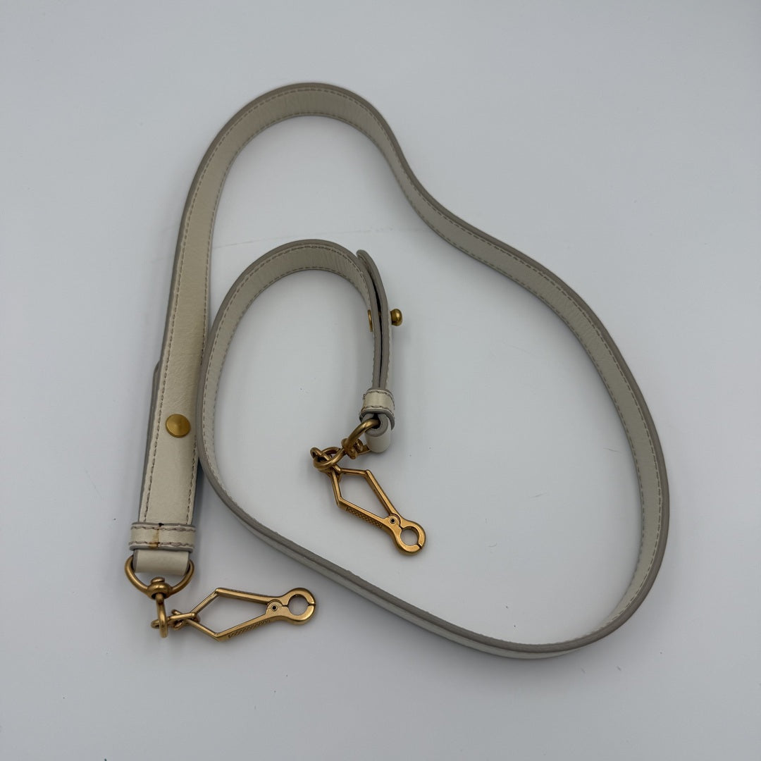 Expertly crafted in high-quality white leather, the Miu Miu Vitello Handbag boasts elegant gold hardware and a magnetic compartment with a convenient zip-up pocket. The iconic gold Miu Miu logo adds a touch of sophistication to this versatile and functional accessory. A must-have handbag.