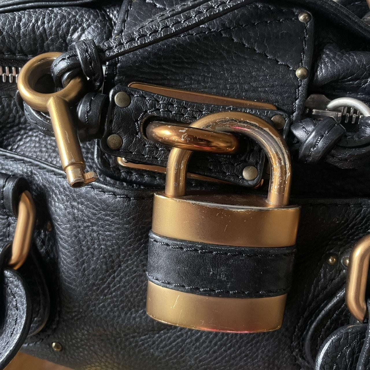 Vintage Classic Regular Size Black Leather Chloé Paddington Bag with Brass-toned Hardware This bag features one large main compartment with two smaller interior compartments, one with a zipper and one suitable for a phone. The other two large main compartments don’t have a zipper and are on either side of the main large zipper compartment. Brand: Chloé Size (approx): 14” L x 8” H x 6” D Condition: 9/10, regular vintage wear such as wear on metal only.